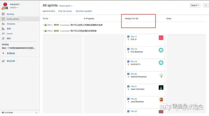 在Active Sprint项目中增加Ready For QA列,用于过程测试动作的显示。