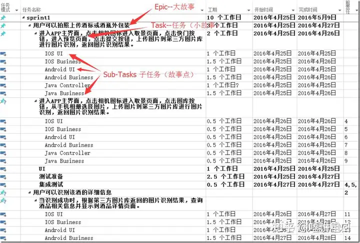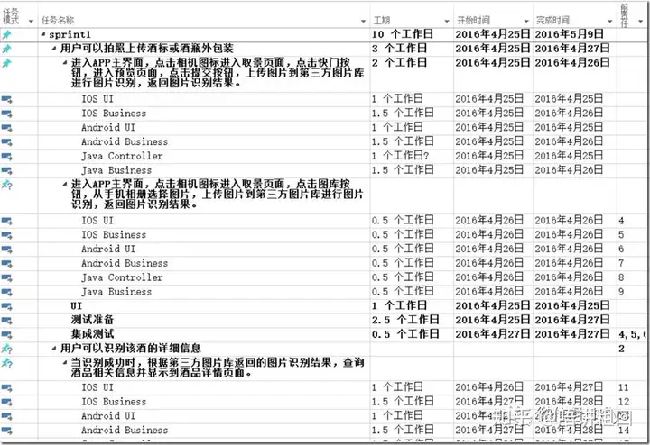 1、在上面的第三步时需要做工作拆分及工作量估算,会得到一个类似下面的项目计划表,JIRA的Scrum项目管理也是基于此表