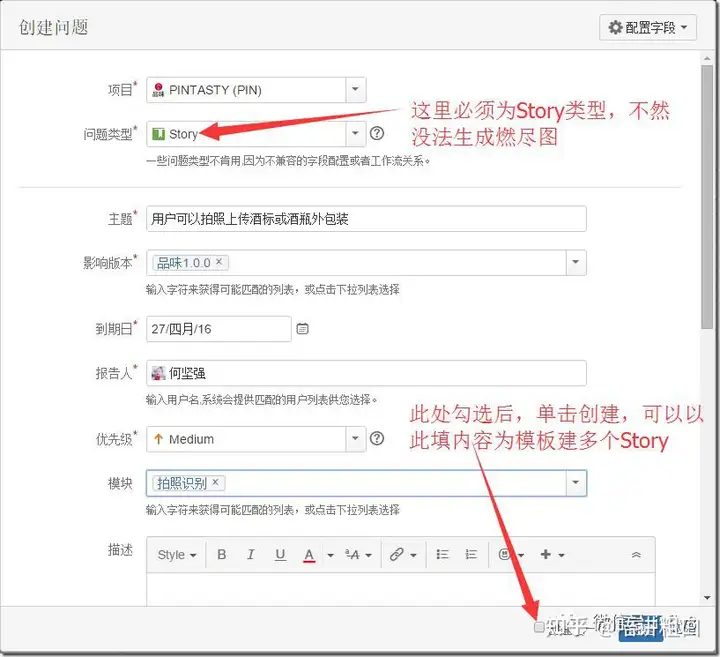 4、建立story(即Scrum开发中所说的Story,如果还有子任务,这个story可以不指定经办人)